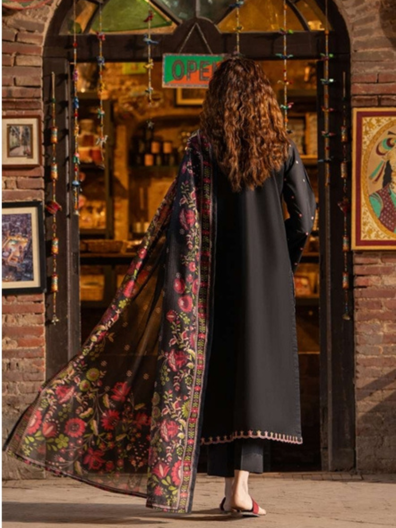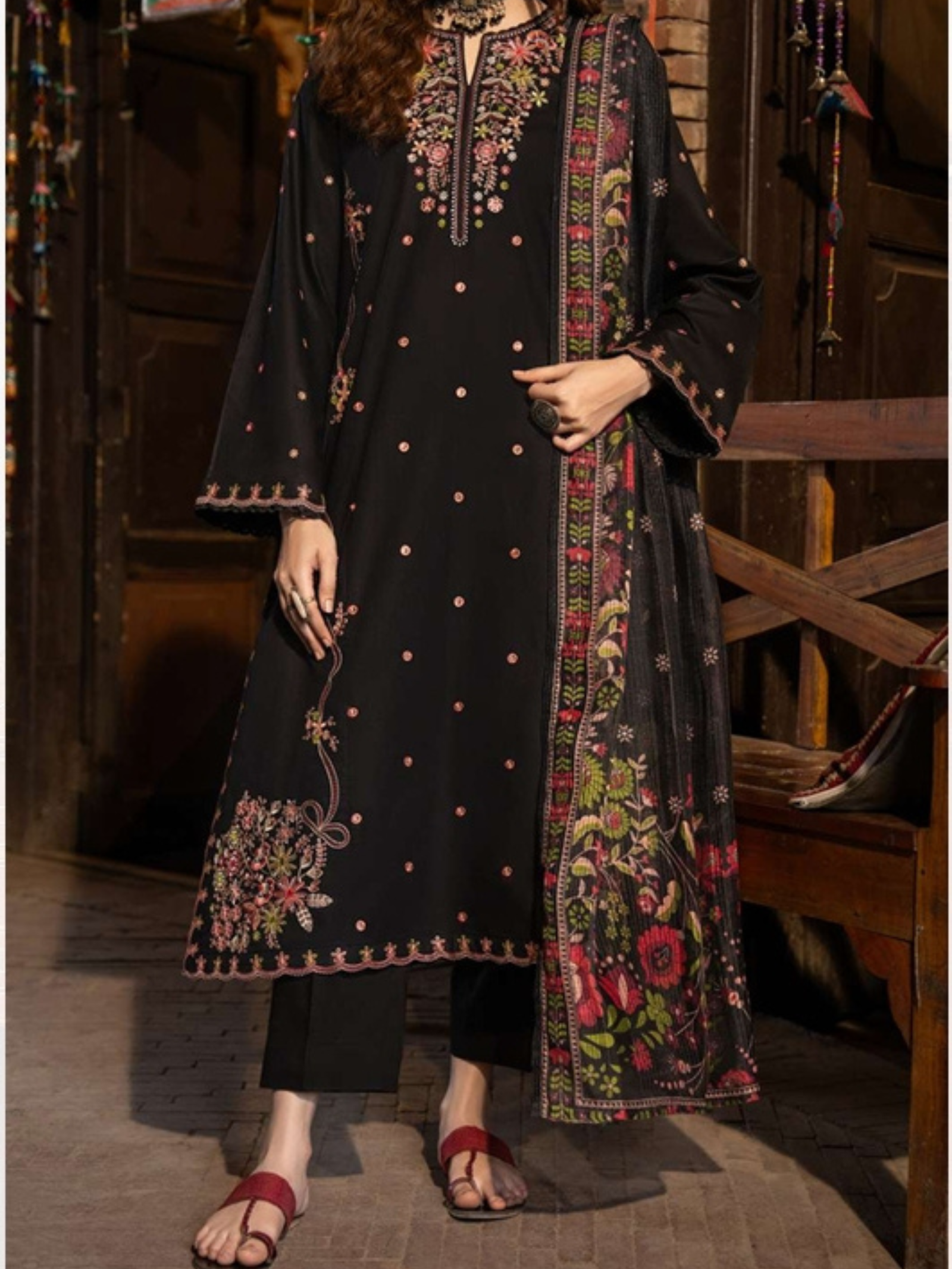 Serene Casual Suit” – A beautifully embroidered shirt with delicate detailing, paired with a straight-fit trouser for comfort and style. Complemented by a printed chiffon dupatta, adding grace to the ensemble. Perfect for an effortless casual look! ✨