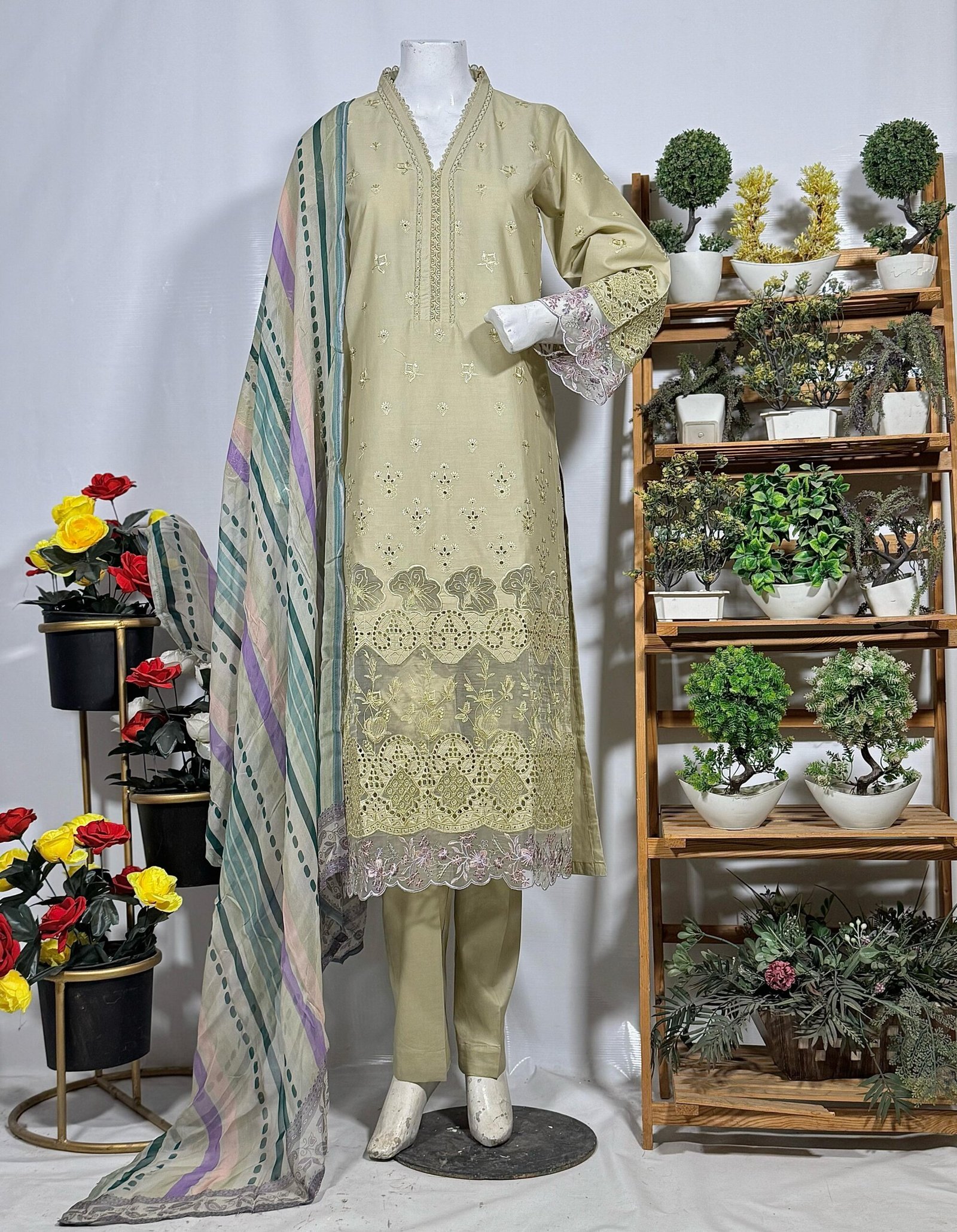 Premium quality fabric with intricate embroidery on the neckline and sleeves.