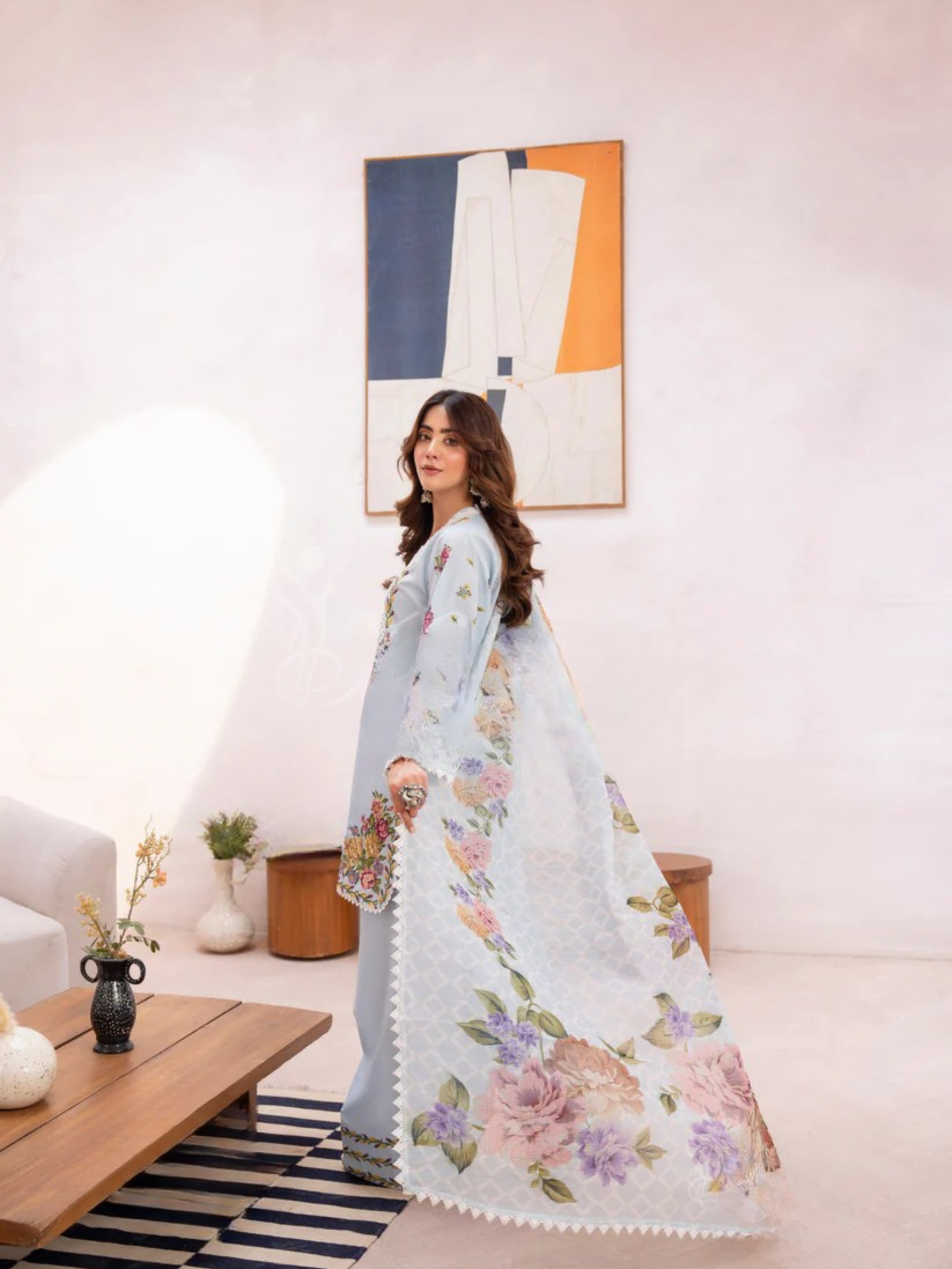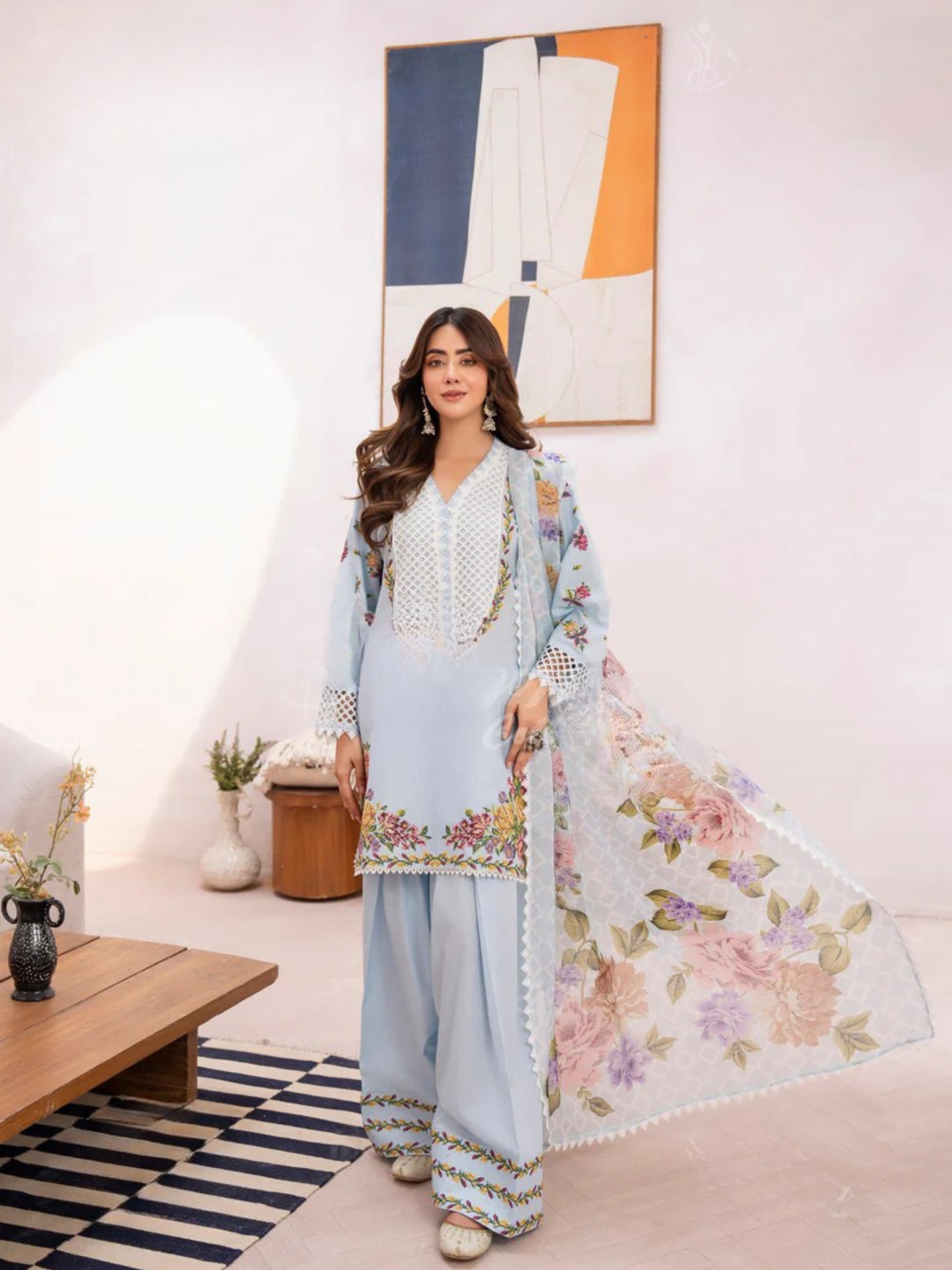 A fresh 3-piece suit featuring a serene periwinkle blue shirt with delicate lace sleeves, paired with a stunning floral print organza dupatta.