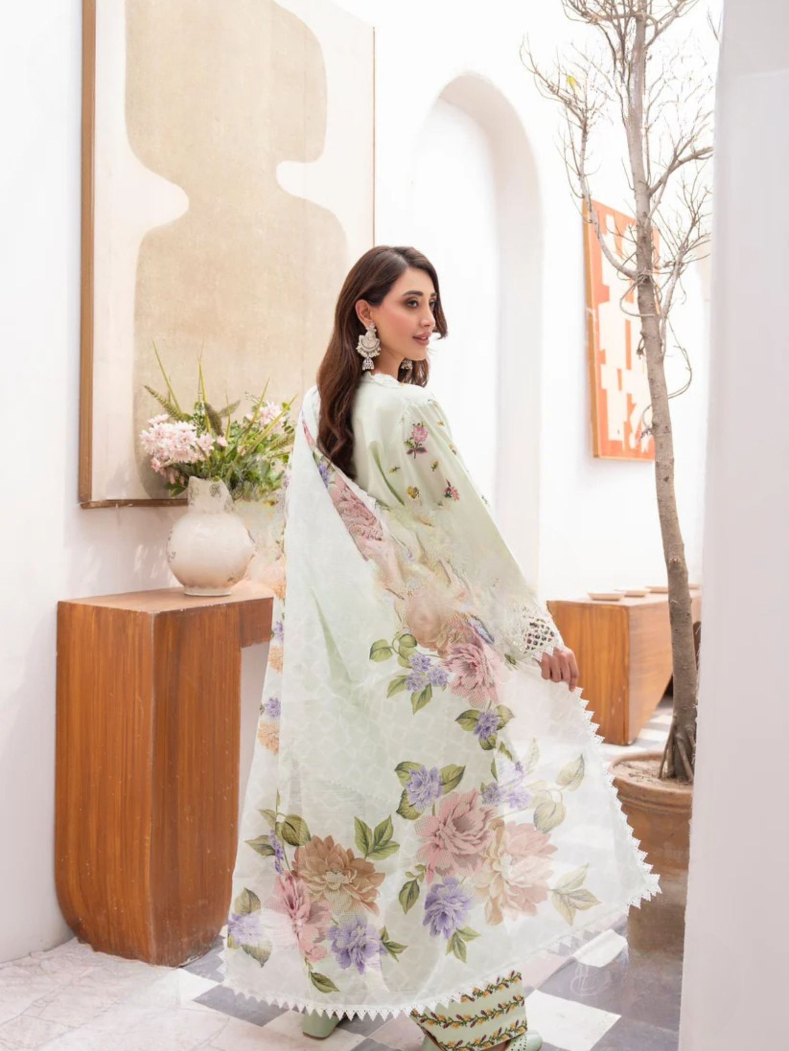 Embrace fresh sophistication with this mint green floral ensemble. A gorgeous white lace neckline and vibrant floral embroidery are perfectly complemented by a lush, floral-printed dupatta.