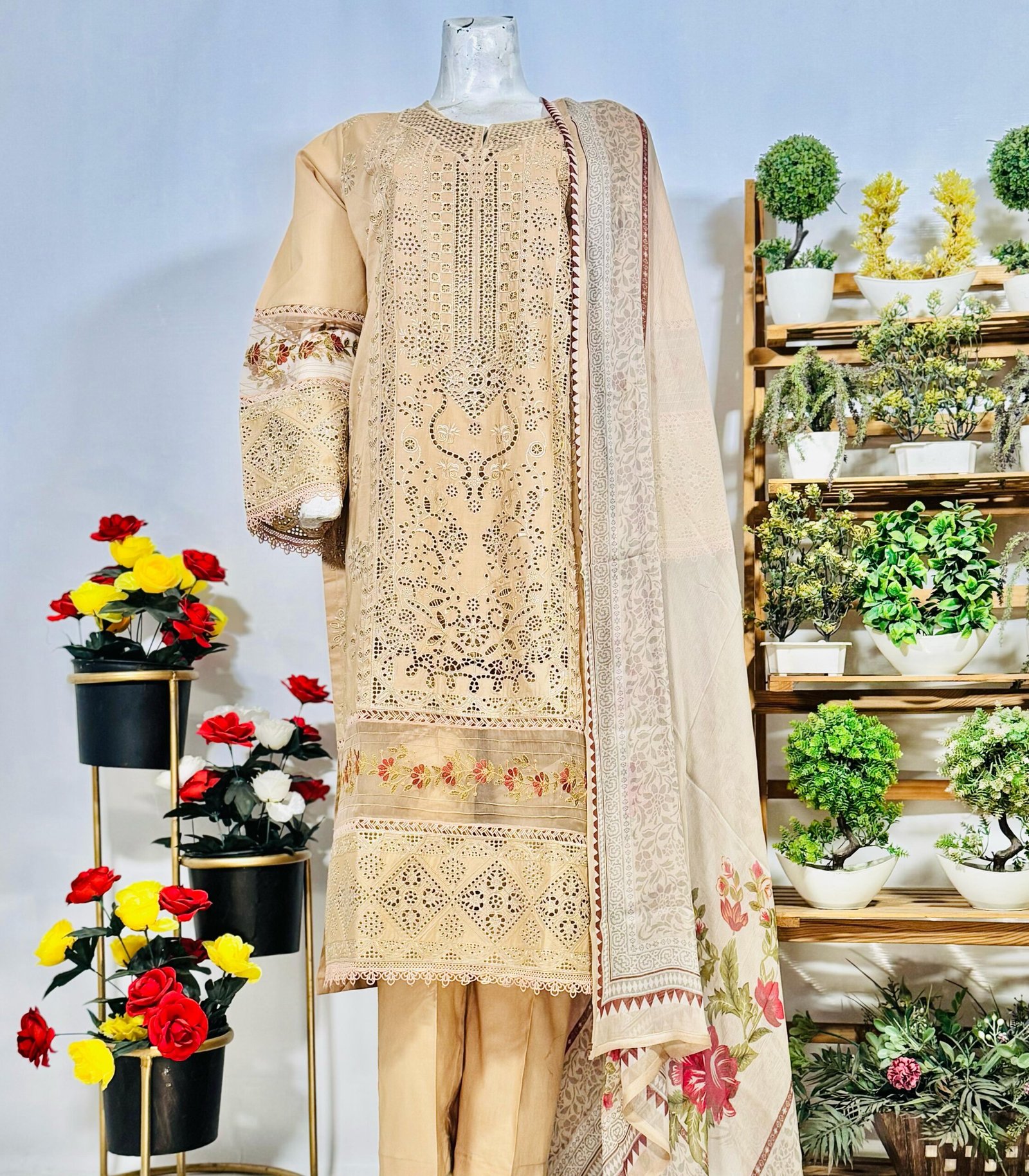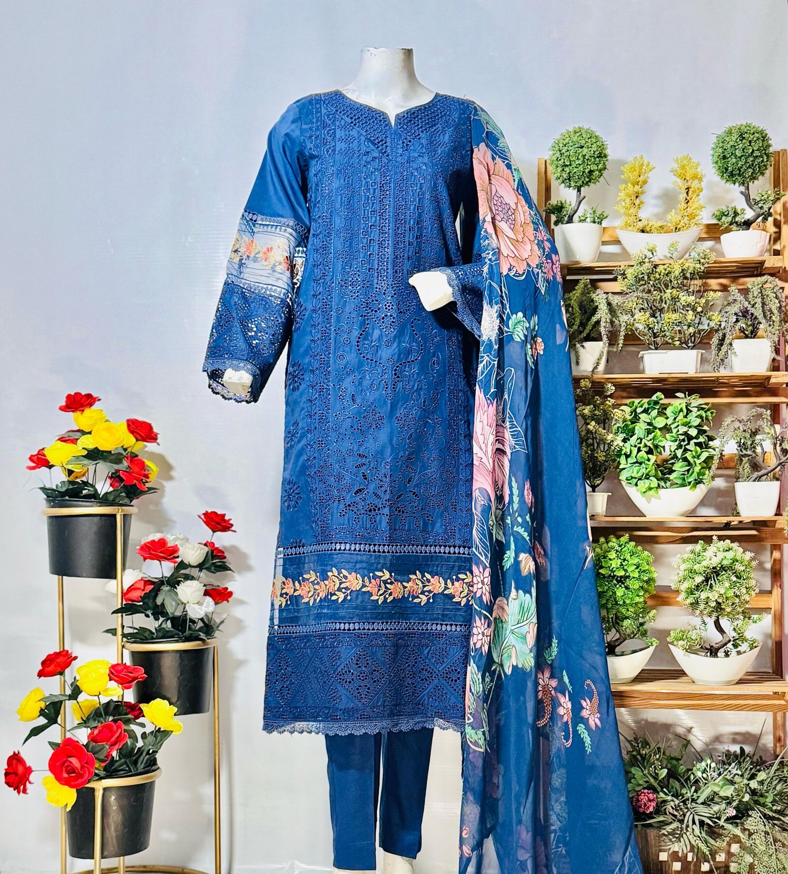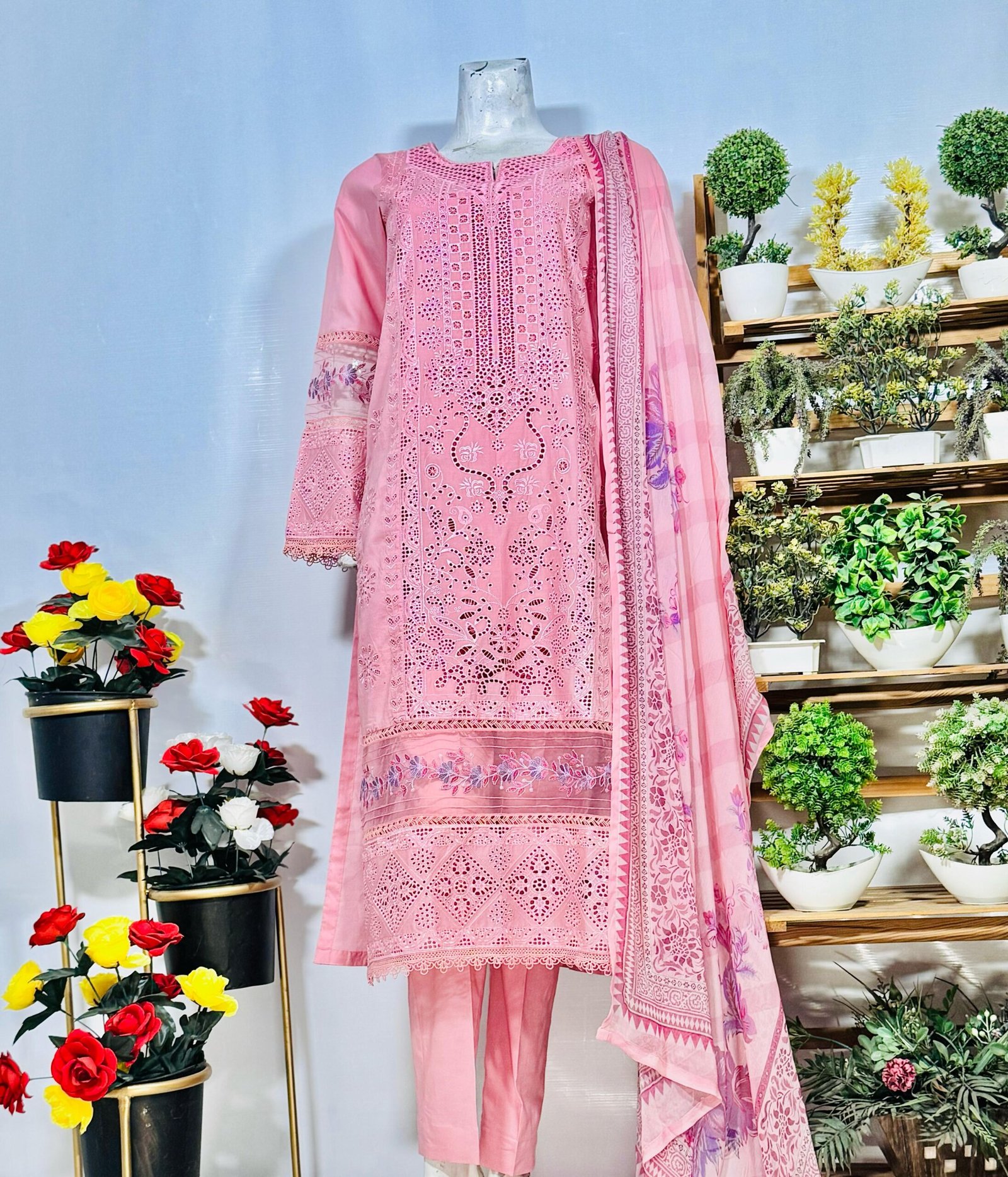 Embroidered Cutwork Suit featuring a beautifully designed shirt with intricate cutwork embroidery, a lightweight dupatta with delicate prints, and a comfortable plain trouser. Perfect for casual wear with a touch of elegance. ✨