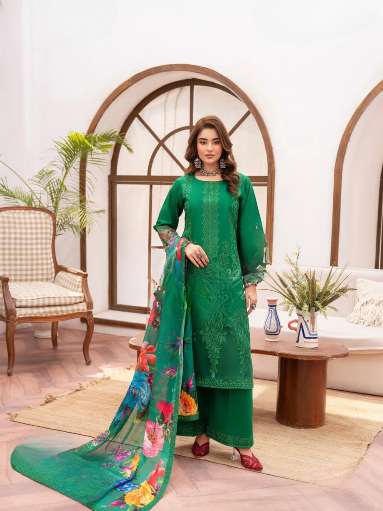 A captivating 3-piece suit in vibrant emerald green, featuring textural self-embroidery and a stunning, multi-colored floral print on the dupatta and cuffs.