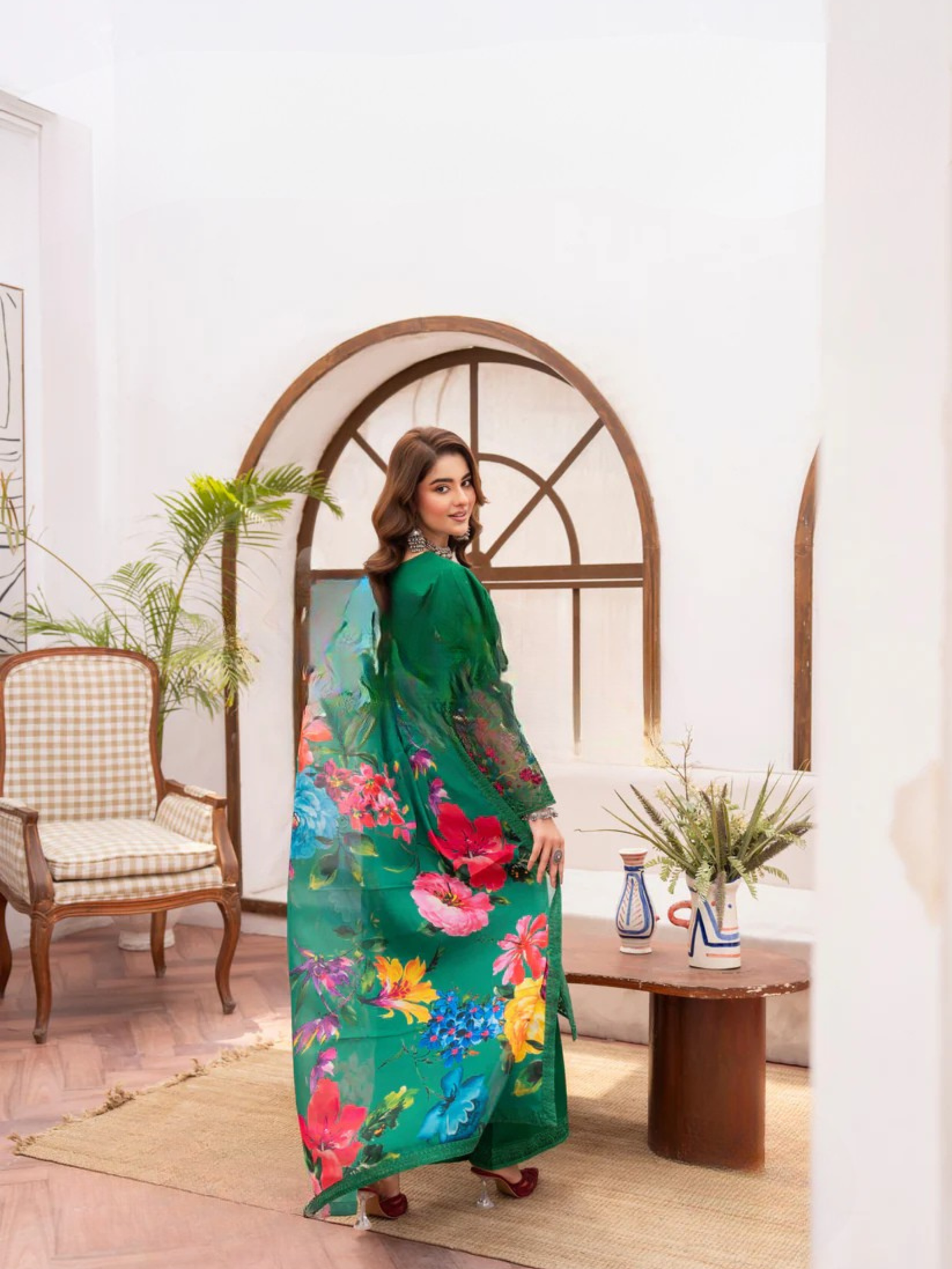 - Luxurious digital printed chiffon dupatta, offering a fluid and graceful drape.